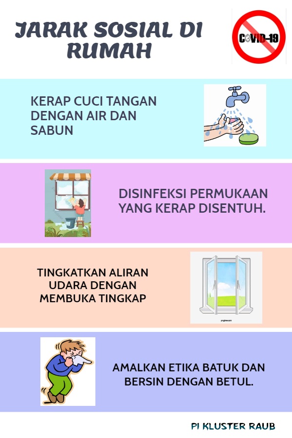 JARAK SOSIAL DI RUMAH: 1. KERAP CUCI TANGAN DENGAN AIR SABUN 2.DISINFEKSI SETIAP PERMUKAAN YANG KERAP DISENTUH 3. TINGKATKAN ALIRAN UDARA DENGAN MEMBUKA TINGKAP 4. AMALKAN ETIKA BATUK DAN BERSIN DENGAN BETUL