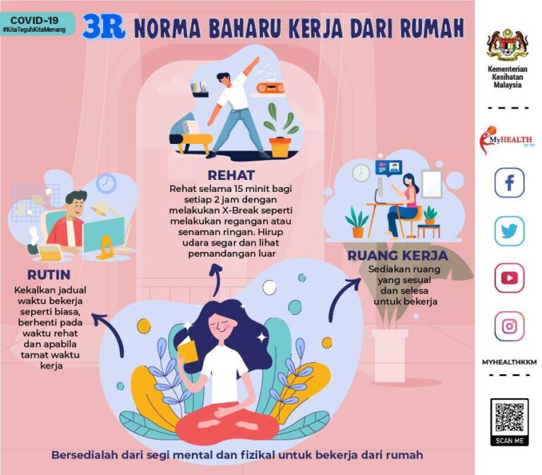 Norma Baharu Kerja Dari Rumah. Mungkin ada orang seronok bekerja dari rumah sampai terlupa waktu rehat. Jom lakukan X Break setelah duduk berterusan selama 2 jam. Ikut 3R: i. Rutin ii.Rehat iii.Ruang Kerja